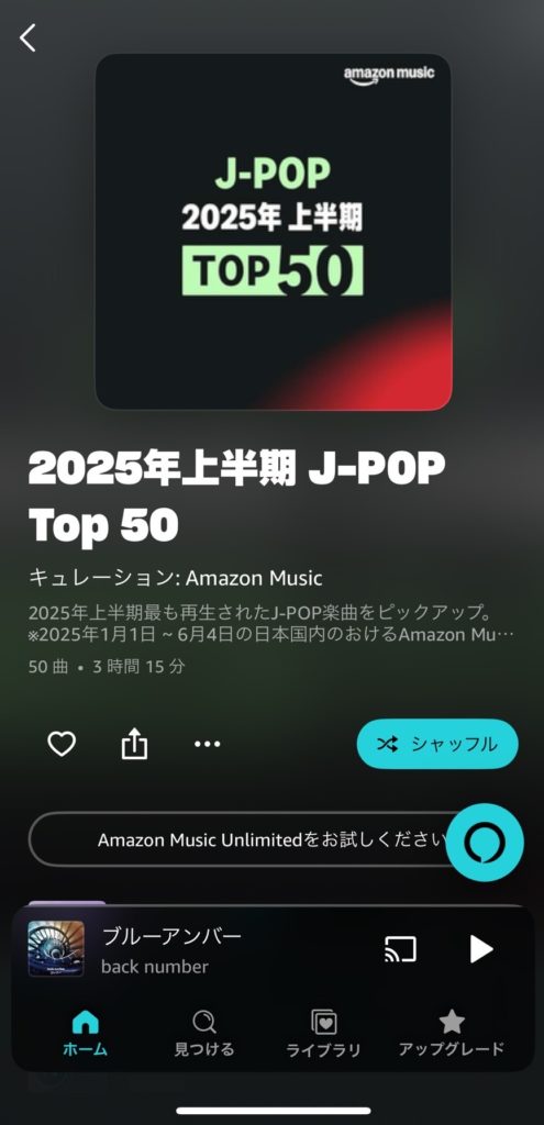 「amazon music」で、適当に「2025年上半期J-POP50」というプレイリストを選んでみました。