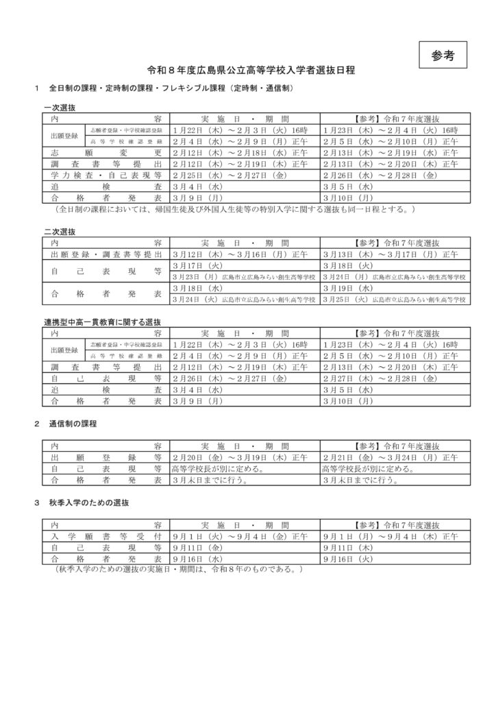 令和8年度の広島県公立高校入試の日程が発表されました。日程に関しては昨年と大きく変わらず、2月25日から28日までの3日間、学力検査と自己表現(面接)を実施し、1週間後の3月9日に合格発表となります。(下記参照)